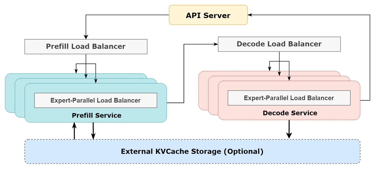 - Decode:路由专家 EP144、MLA 和共享专家 DP144,一个部署单元是 18 节点,32 个冗余路由专家,每张卡 2 个路由专家和 1 个共享专家